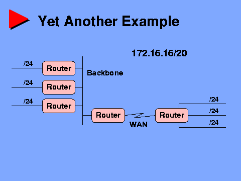 How large must the two summary blocks be? Well, the left-hand side of the network contains three /24 subnets, and the backbone, which fit into a /22 block. A /22 is also sufficient for the right-hand side of the network. Since four 22-bit prefixes fit within a 20-bit prefix, we have plenty of room. We'll being by assigning 172.16.16/22 to the left-hand side and then assign 172.16.20/22 to the right-hand side.